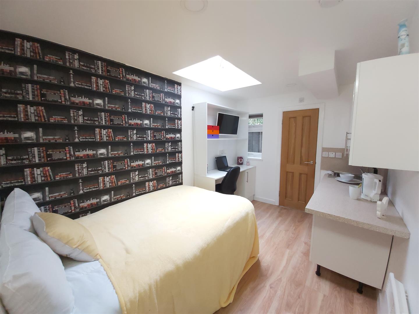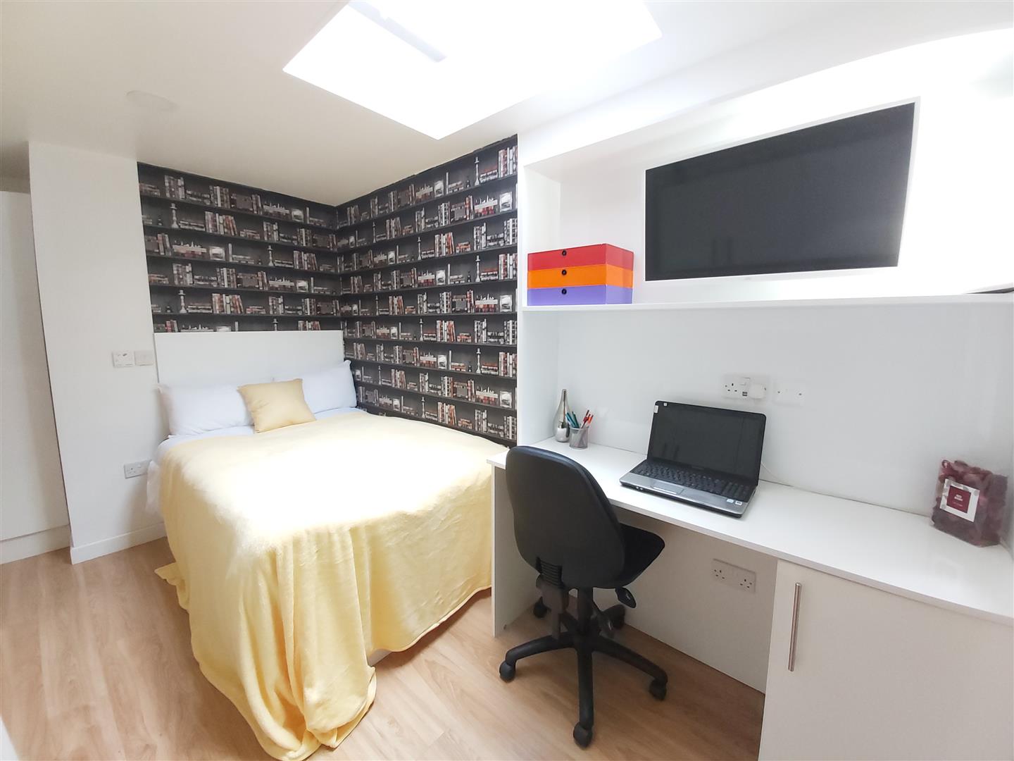 A brand new studio style property consisting of a modern fitted snack area, an open plan dining/living area and a smart fitted self-contained shower/toilet room. This spacious accommodation is fully double glazed and furnished with student essentials including a double bed, storage, study desk and chair, flat-screen TV, low-noise white goods, ands more.
