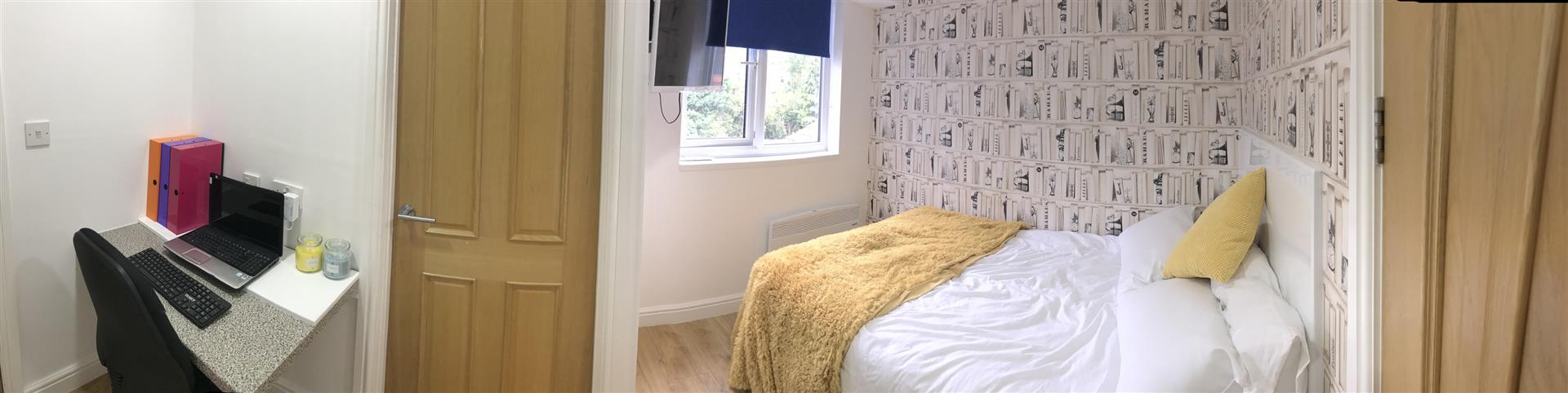 A brand new studio style property consisting of a fitted snack area, an open plan dining/living area and a smart fitted self-contained shower/toilet room. This spacious accommodation is fully double glazed and furnished with student essentials, including a double bed, storage, study desk and chair, flat-screen TV, a quality low-noise fridge/freezer, and more.